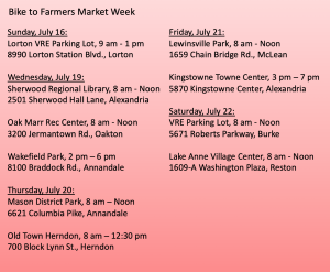 FABB is again working with Fairfax County Park Authority staff to sponsor Bike to Farmers Market Week during July 16-22. We need volunteers to attend the markets across the county to talk to potential riders about the benefits and joys of biking and encourage them and existing cyclists to use bikes for market and other short trips.