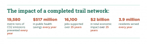 The report found that, among many impacts, a complete trail network could have $2 billion in total economic impact over 25 years while preventing 19,580 metric tons of CO2 emissions annually with an attendant $517 million in public health savings every year.