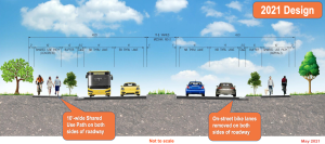 The project includes a shared-use path and sidewalk along both sides of the four-lane divided roadway. This is a significant improvement to original plans that called for unprotected bike lanes on the street.