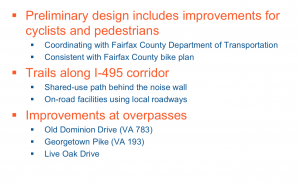 The project’s goal is to reduce the terrible congestion at one of the worst bottleneck in the region and the serious impact cut-through traffic is having on local neighborhoods around Georgetown Pike, Balls Hill Road, and Lewinsville Road. The study and future plans will be coordinated and compatible with plans for I-495 in Maryland and the eventual expansion of the American Legion Bridge (which also will hopefully include shared-used paths to link the two states).