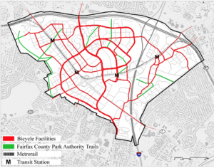 Today, Tysons is becoming ever more bike- and pedestrian-friendly. Ongoing construction and traffic still make it challenging to ride in Tysons. But bike lanes, bike share stations, and trails linking Tysons to other parts of the county are making it much easier to get around. More cyclists are riding in Tysons, and motorists seem to be increasingly aware of the need to watch for riders and to share the road.