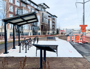 The landscaping around the bridge is nearing completion and this shelter and bike parking area was recently installed.